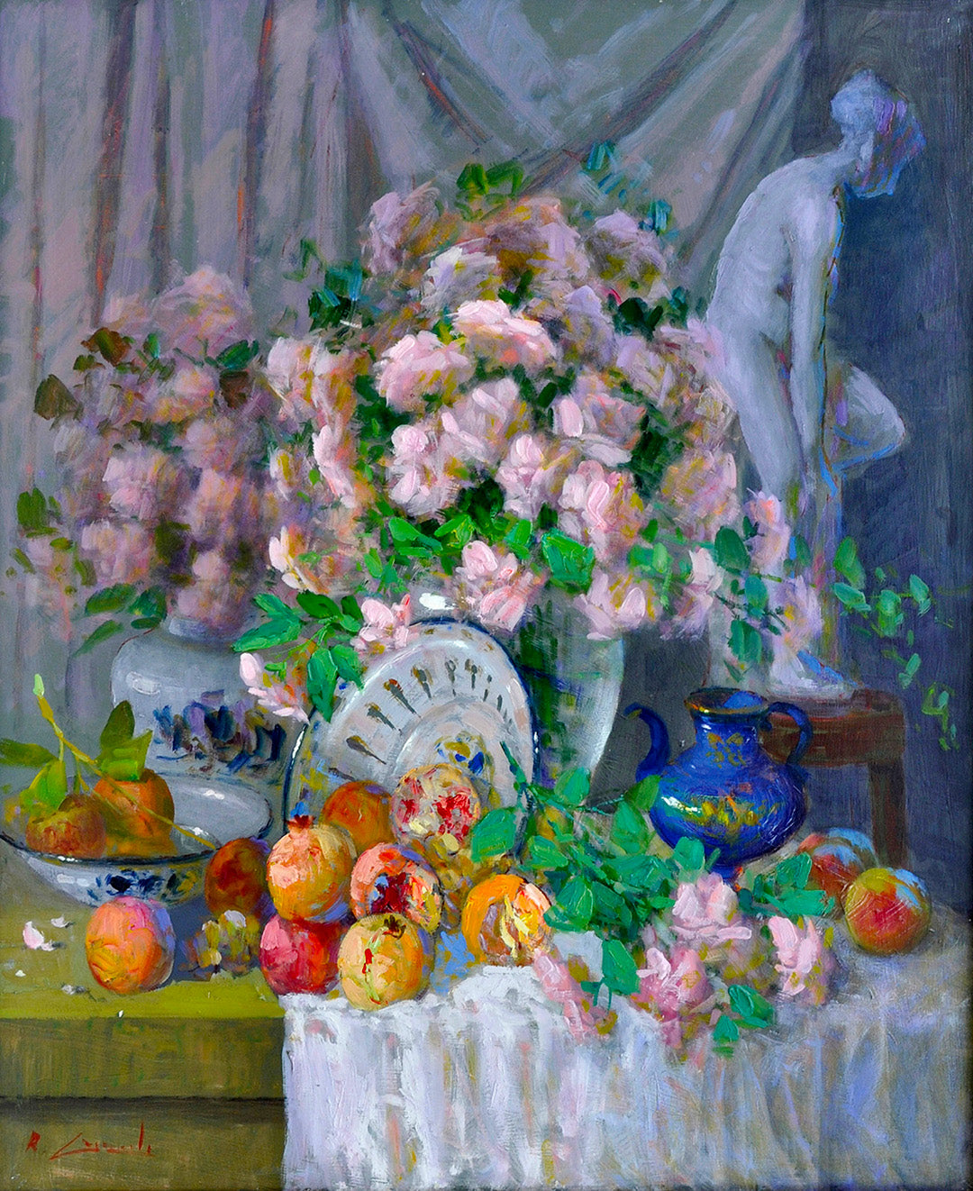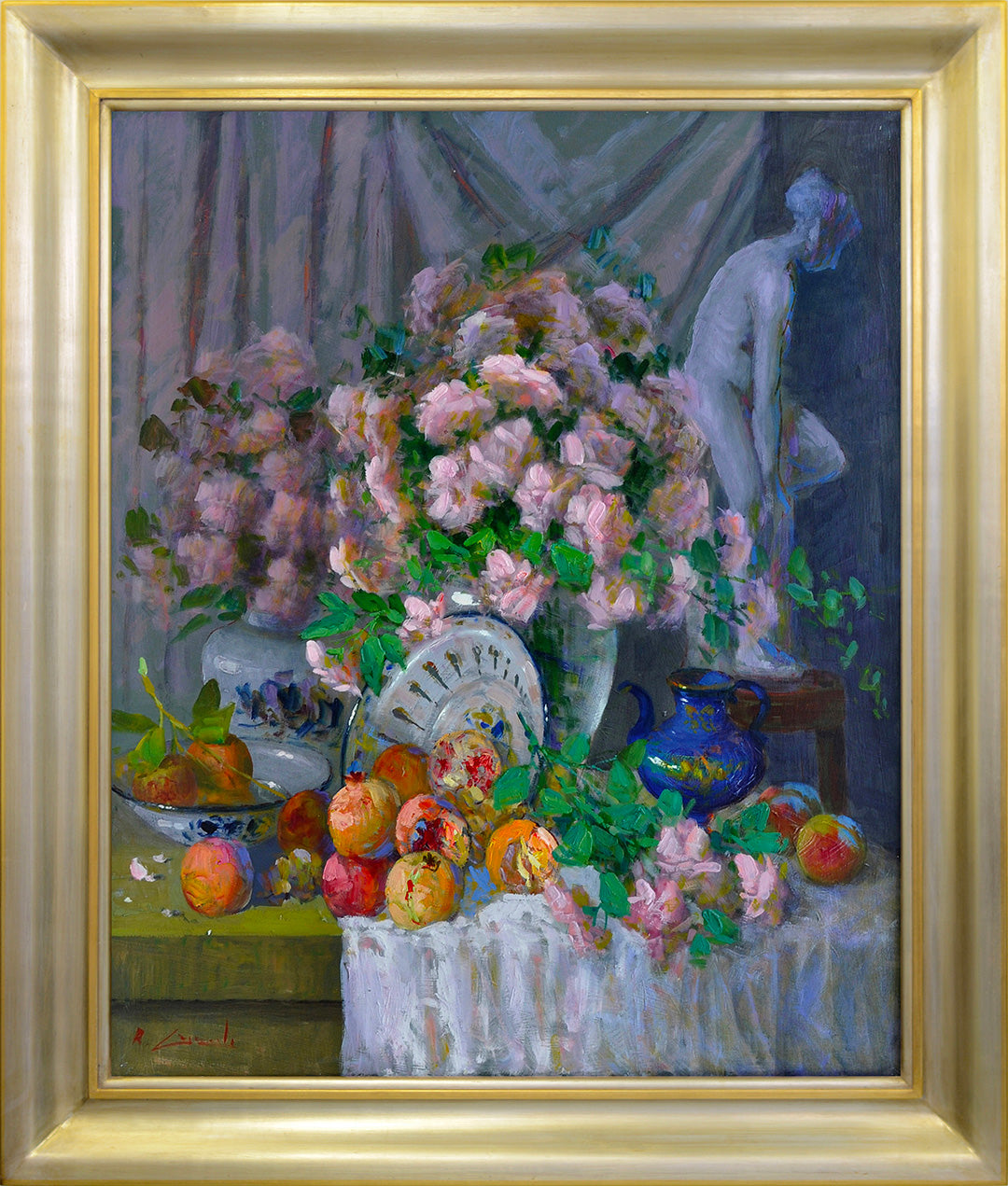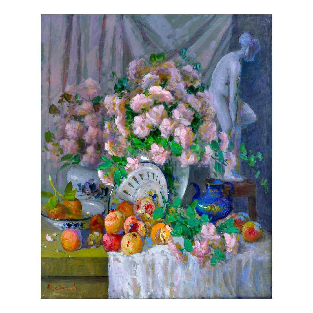 La composizione presenta una lussuosa natura morta arricchita da rigogliosi fiori rosa, frutta dai colori vivaci e una squisita statua sullo sfondo. La giustapposizione di elementi naturali, dettagli in ceramica e presenza scultorea crea un'atmosfera dinamica ma armoniosa, in cui colore e texture risultano quasi tangibili. Le pennellate audaci ed espressive di Criscuolo evidenziano la sua raffinata sensibilità artistica.