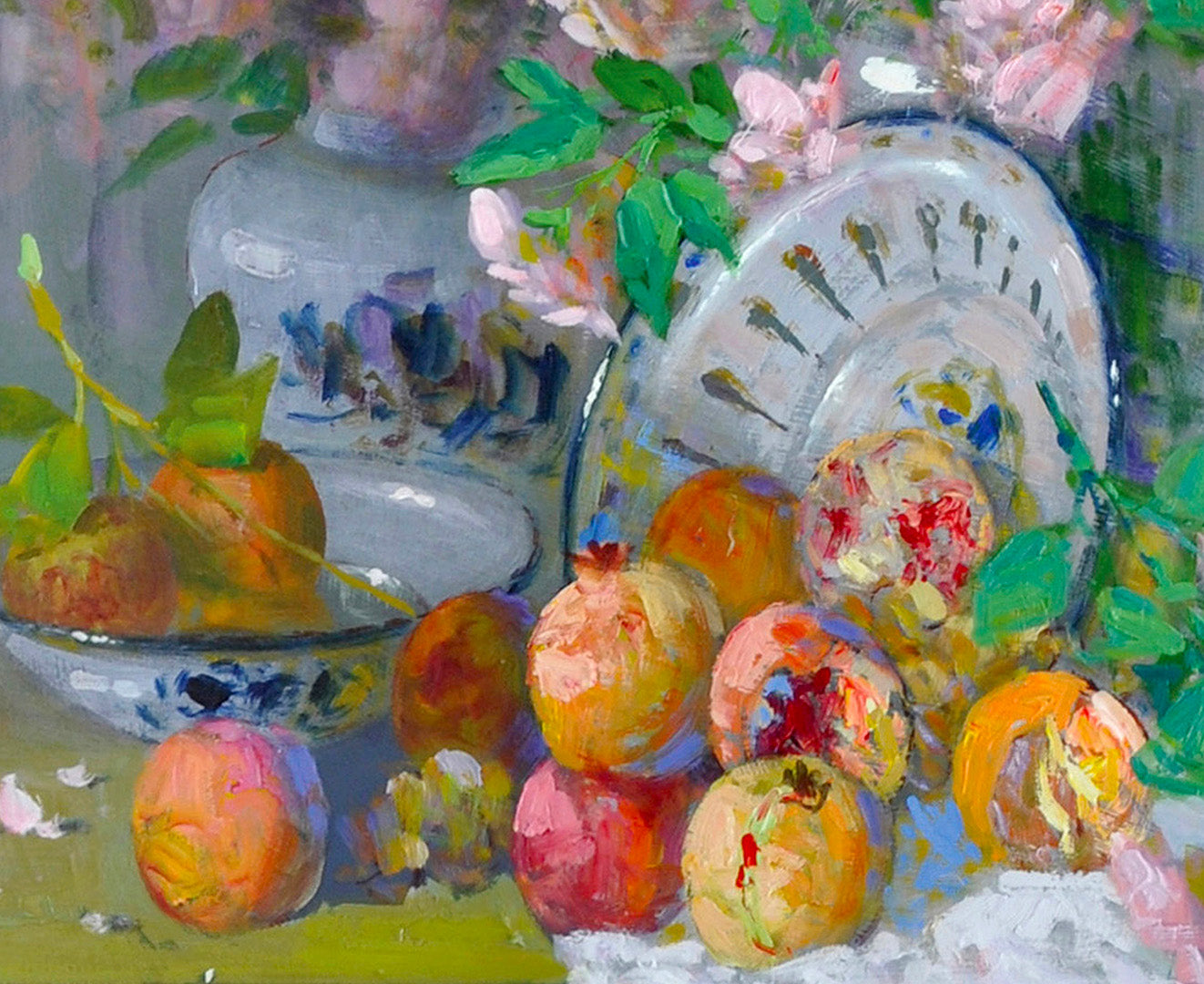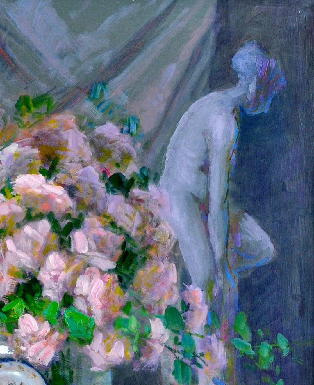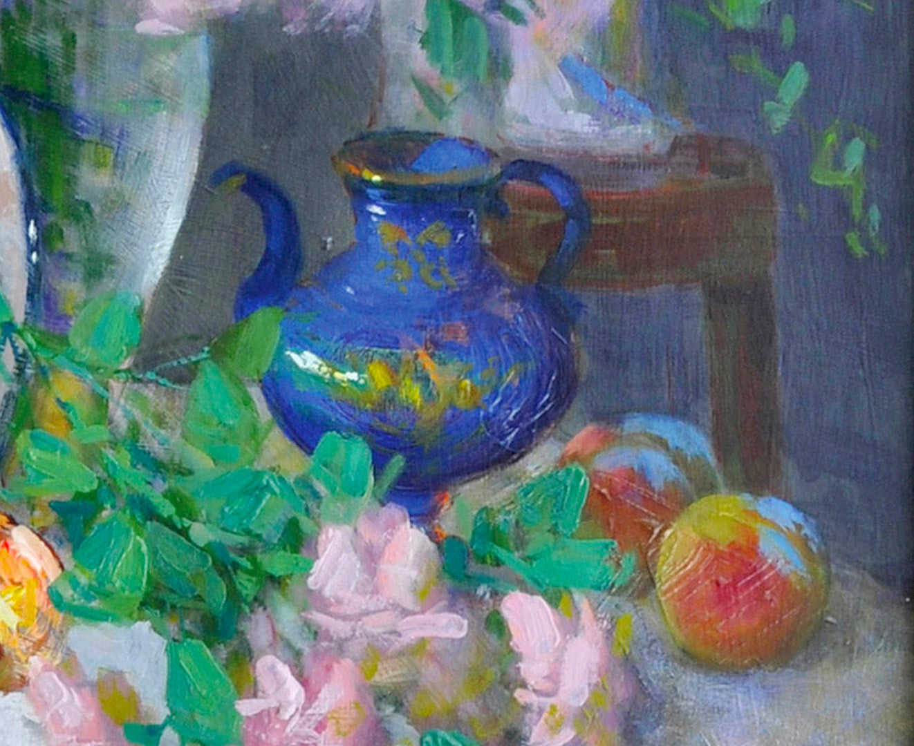 La composizione presenta una lussuosa natura morta arricchita da rigogliosi fiori rosa, frutta dai colori vivaci e una squisita statua sullo sfondo. La giustapposizione di elementi naturali, dettagli in ceramica e presenza scultorea crea un'atmosfera dinamica ma armoniosa, in cui colore e texture risultano quasi tangibili. Le pennellate audaci ed espressive di Criscuolo evidenziano la sua raffinata sensibilità artistica.