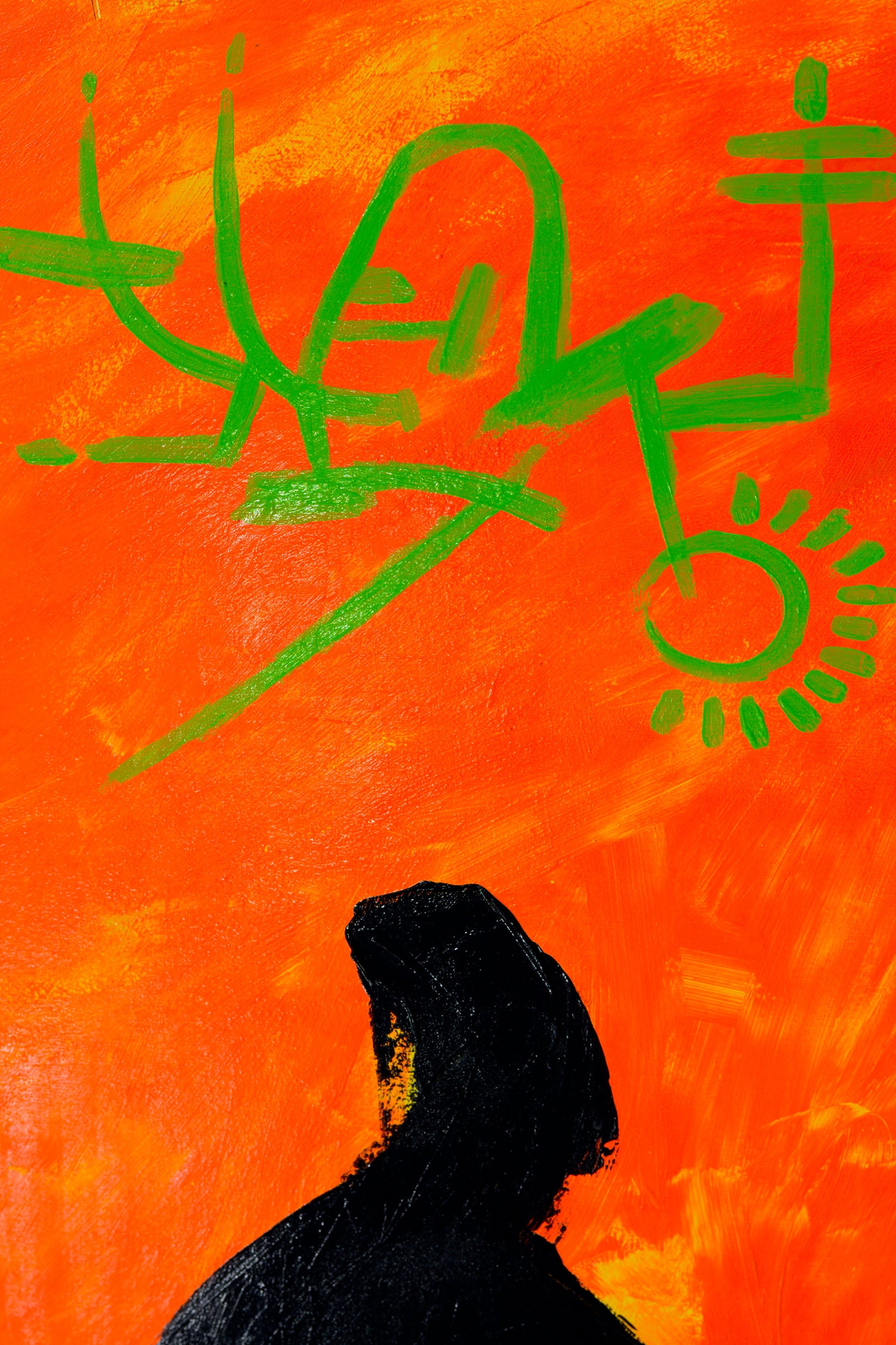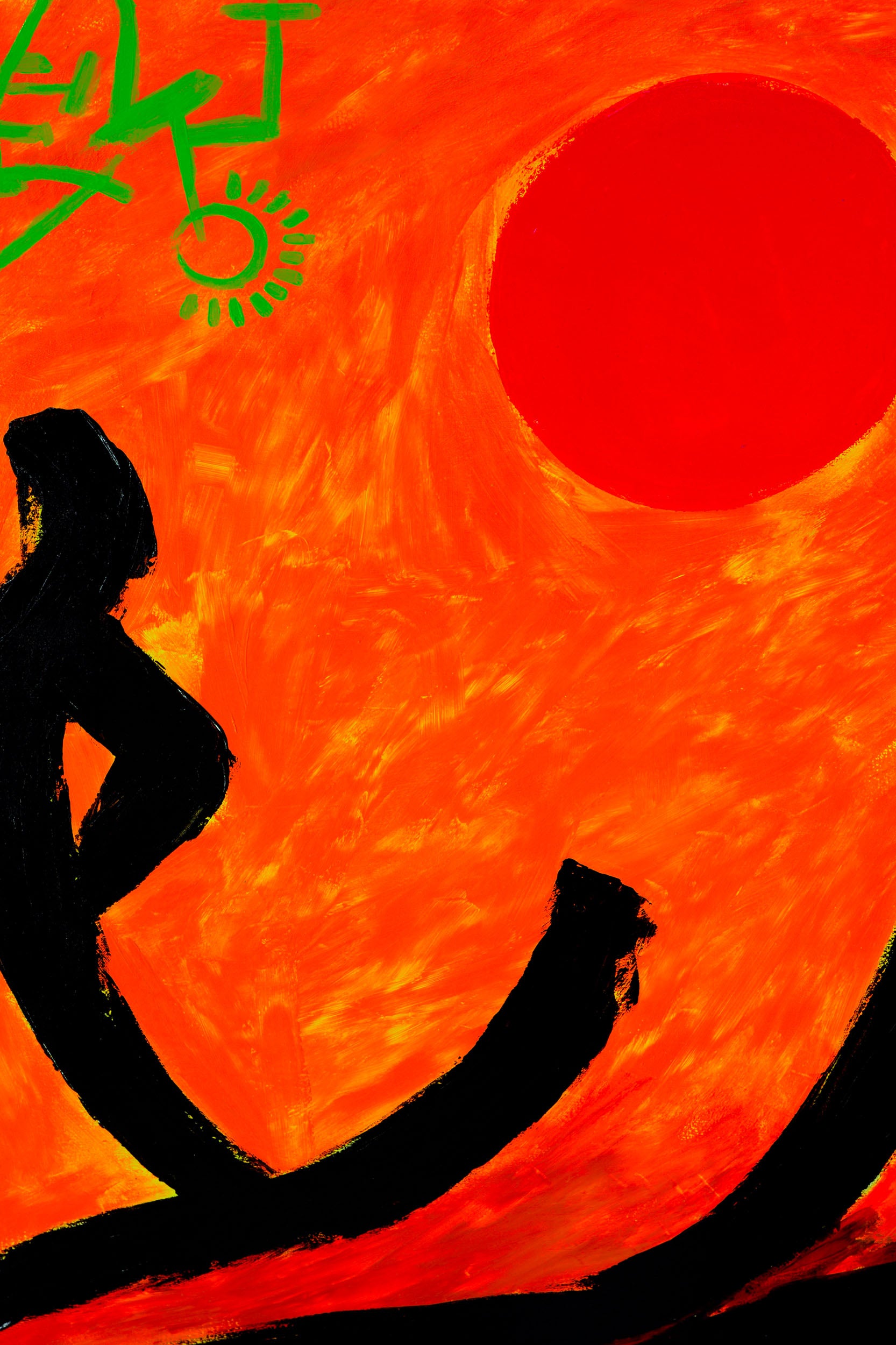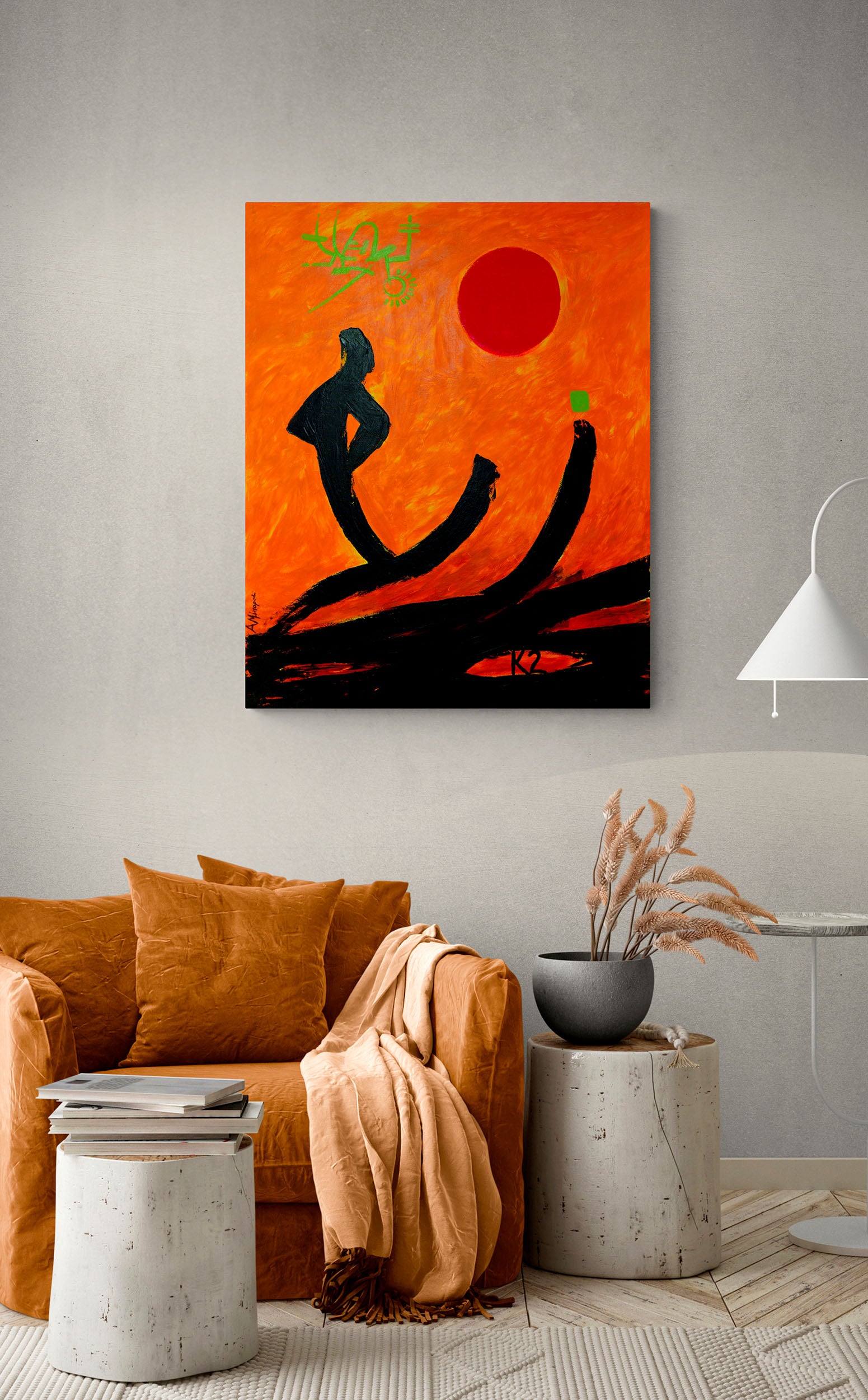 Realizzata in acrilico su tela grezza, l’opera si sviluppa attraverso segni neri intensi che suggeriscono figure umane stilizzate, immerse in un campo cromatico arancione vibrante. Una forma circolare rossa, simile a un sole, introduce un centro simbolico ed emotivo che rafforza la lettura dell’opera.