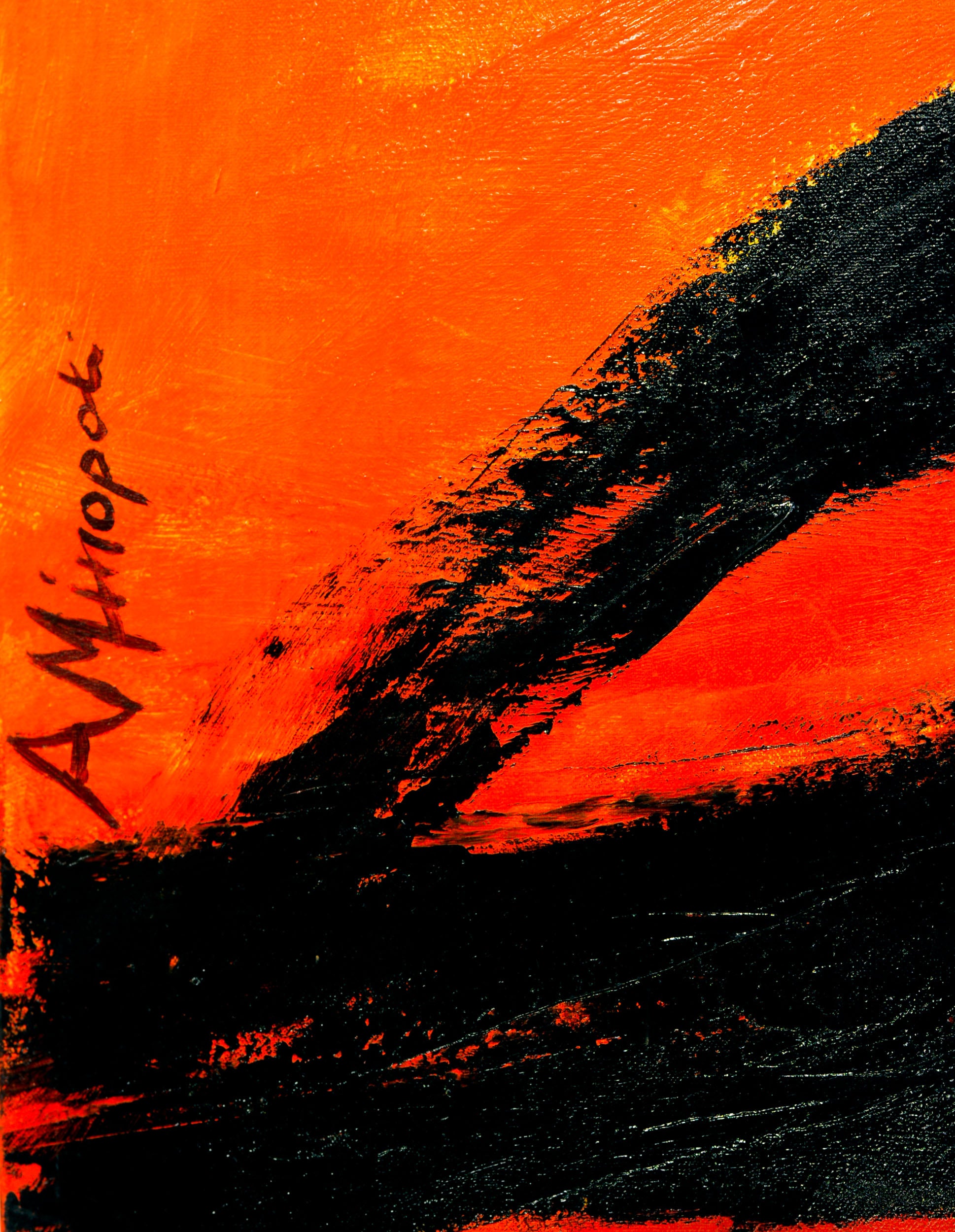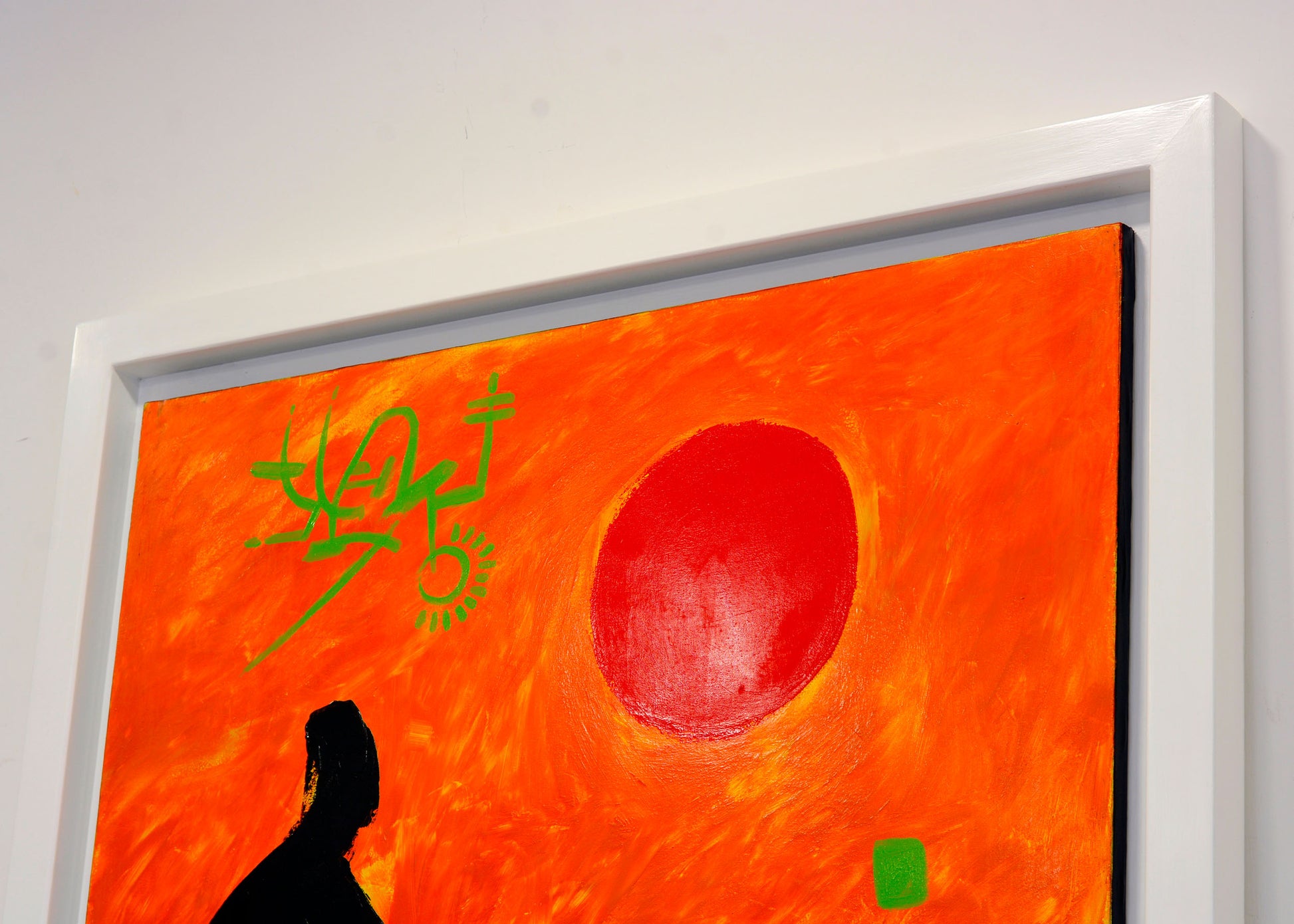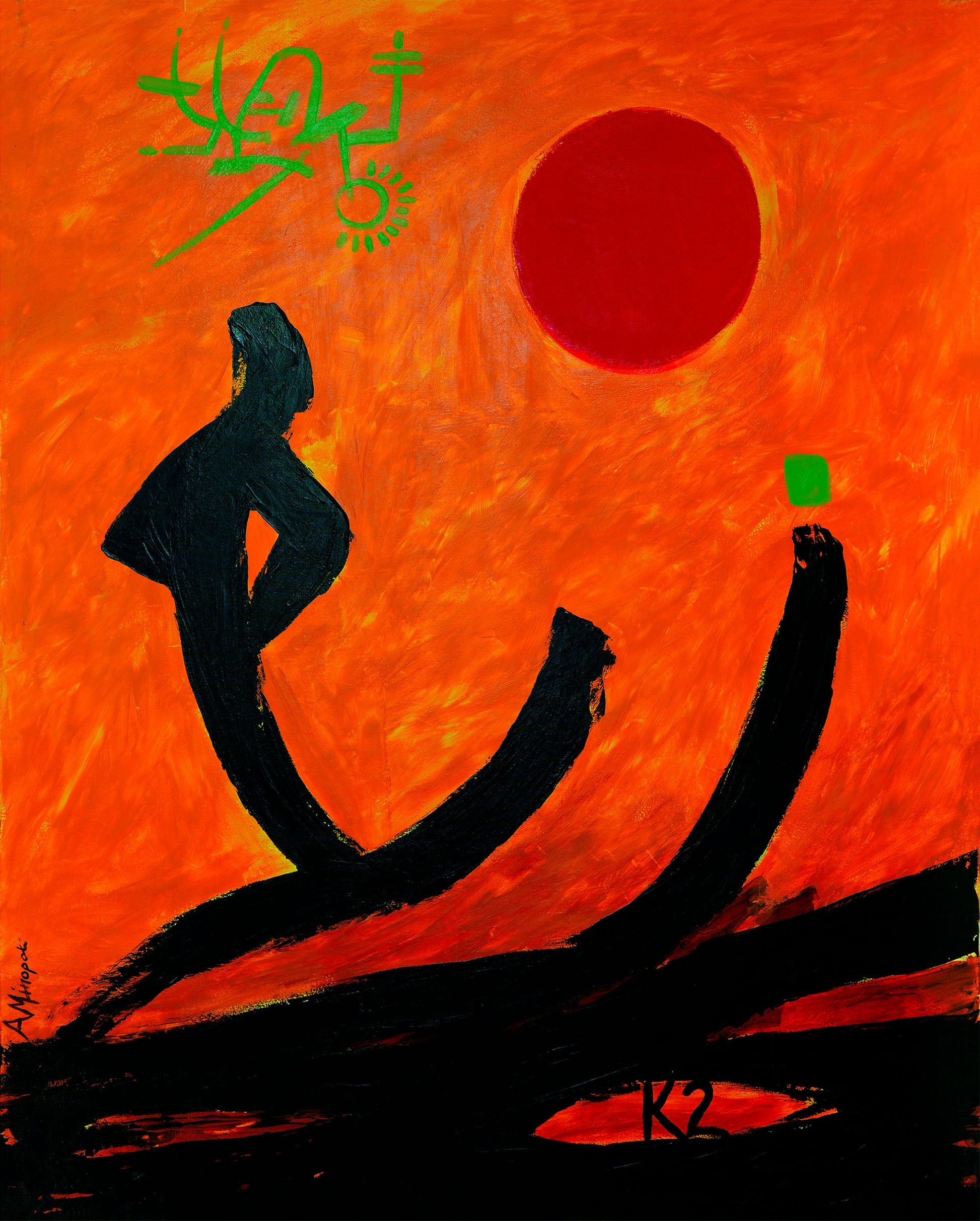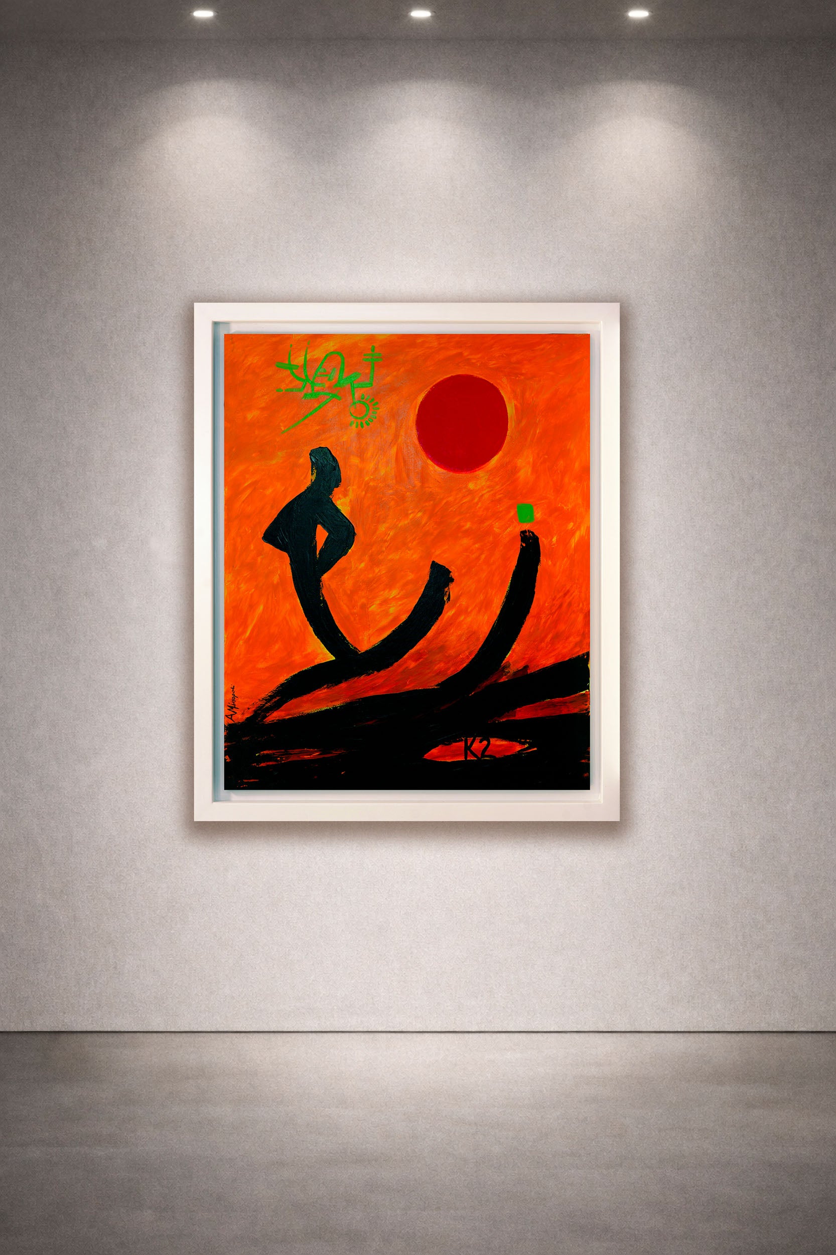 Realizzata in acrilico su tela grezza, l’opera si sviluppa attraverso segni neri intensi che suggeriscono figure umane stilizzate, immerse in un campo cromatico arancione vibrante. Una forma circolare rossa, simile a un sole, introduce un centro simbolico ed emotivo che rafforza la lettura dell’opera.