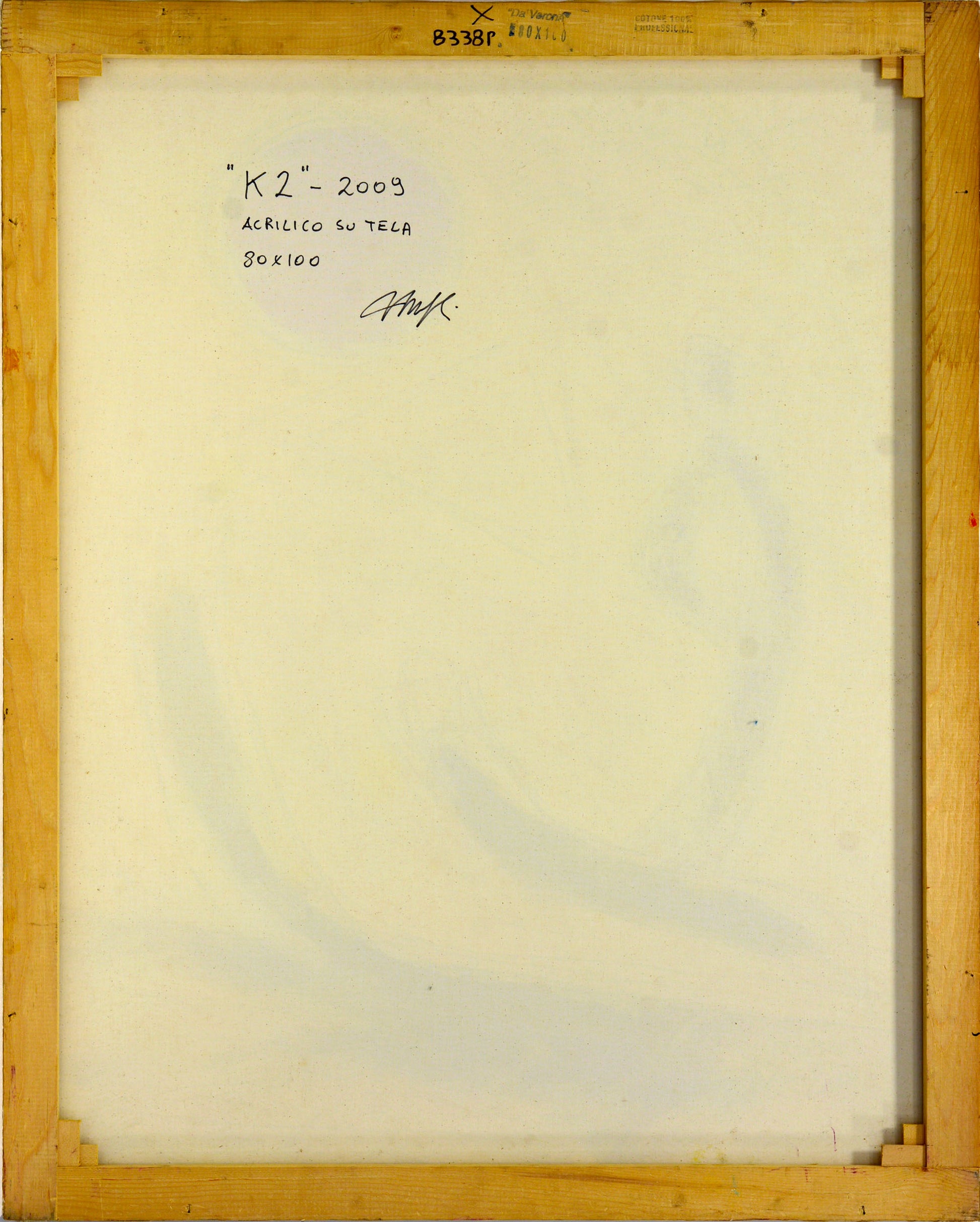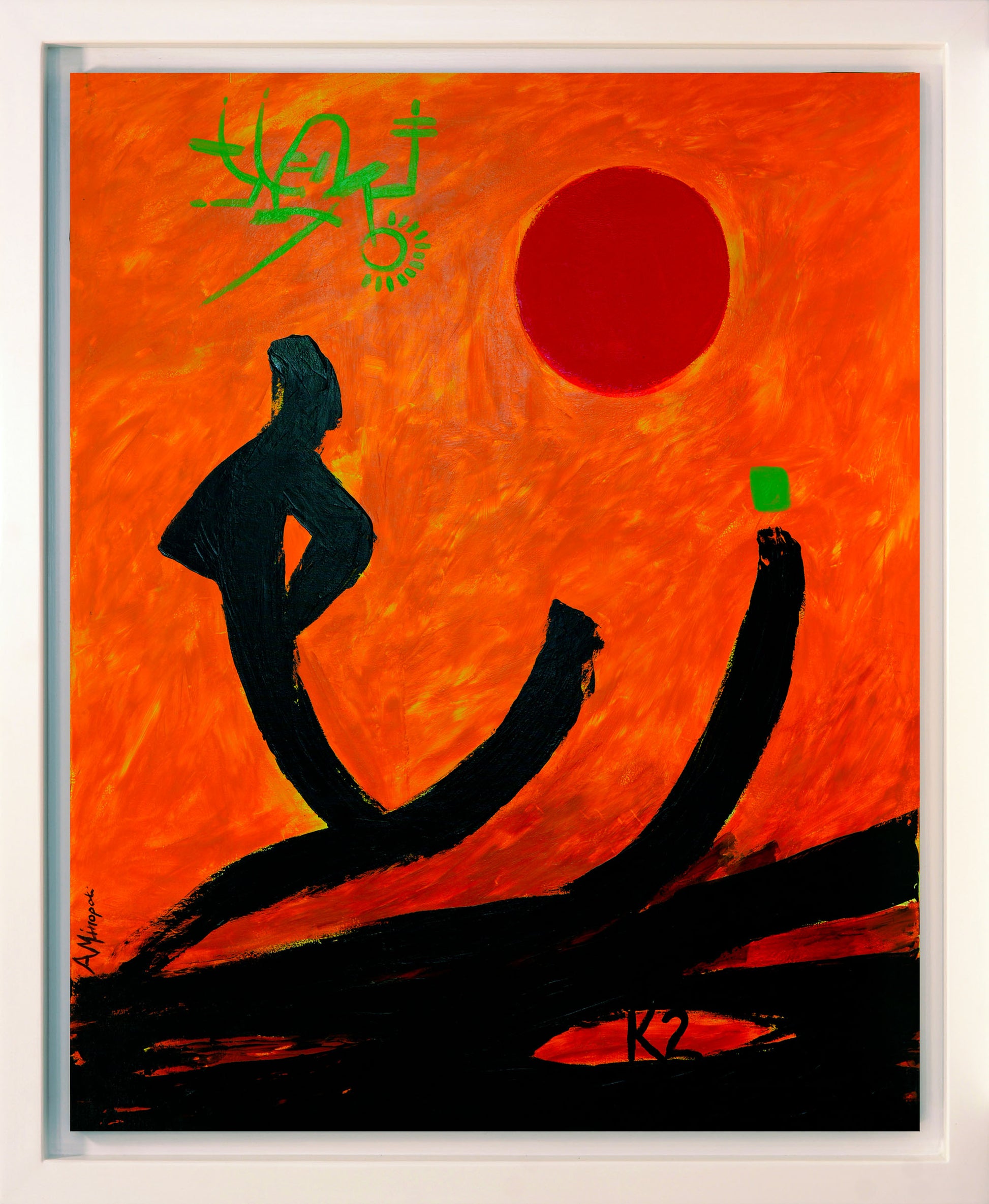 “K2” è un dipinto astratto figurativo di Antonio Minopoli in cui forme essenziali e gesti decisi costruiscono una composizione di forte impatto visivo.