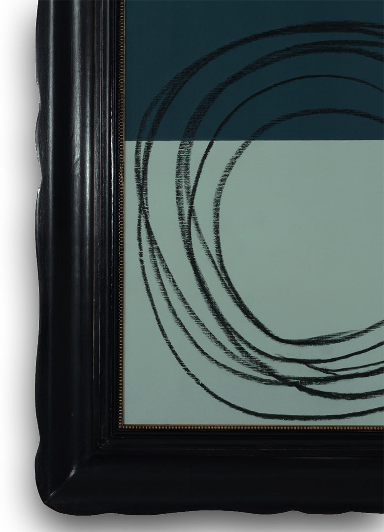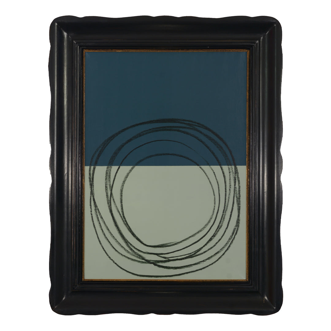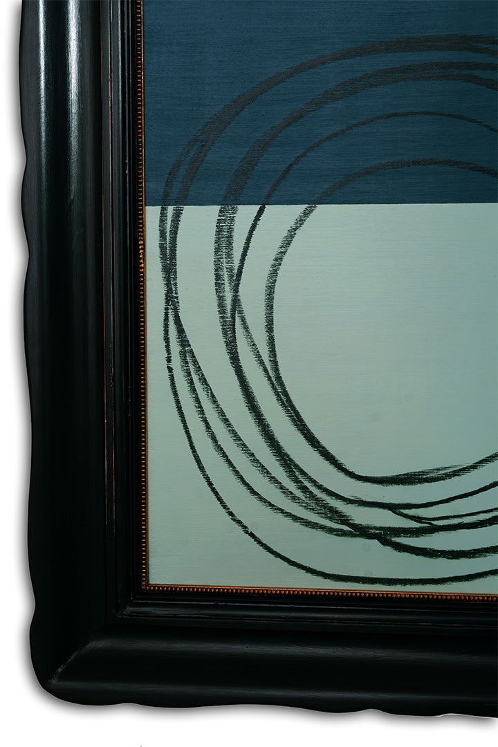 Quest’opera nasce dall’incontro tra un blu petrolio profondo e un verde salvia chiaro—due presenze cromatiche lontane ma complementari.