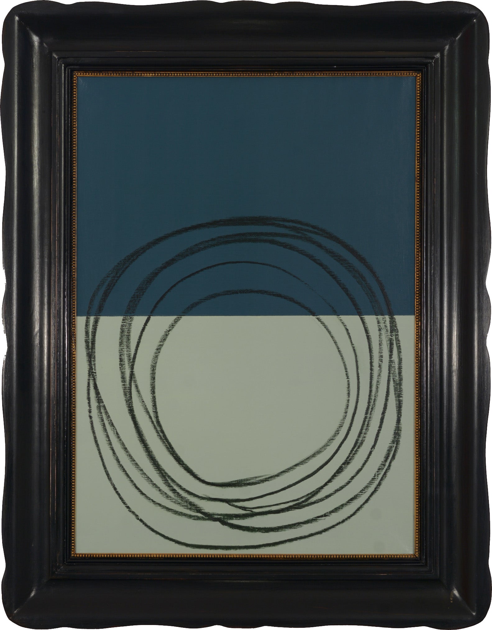 La cornice in legno vintage, restaurata e rifinita in nero satinato con filettatura interna dorata consumata, è parte integrante dell’opera.