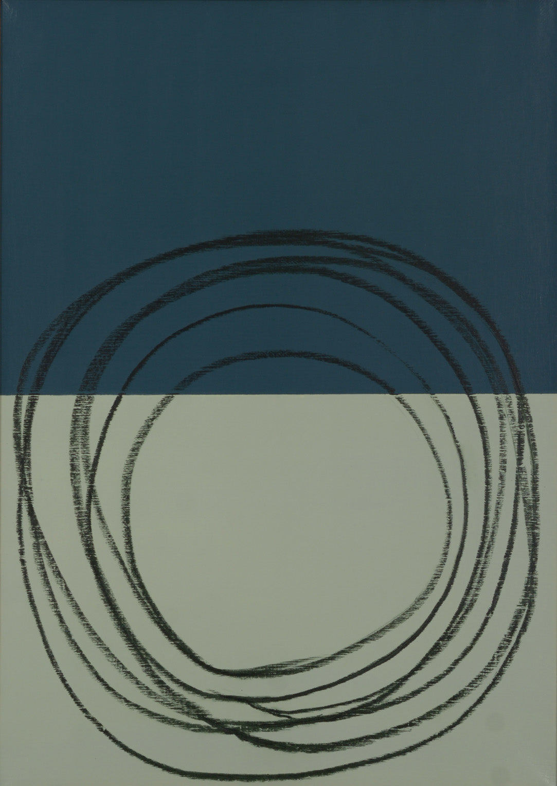 Tra questi due campi prende forma il ciclo: un gesto circolare tracciato a mano libera con pastello a olio nero.