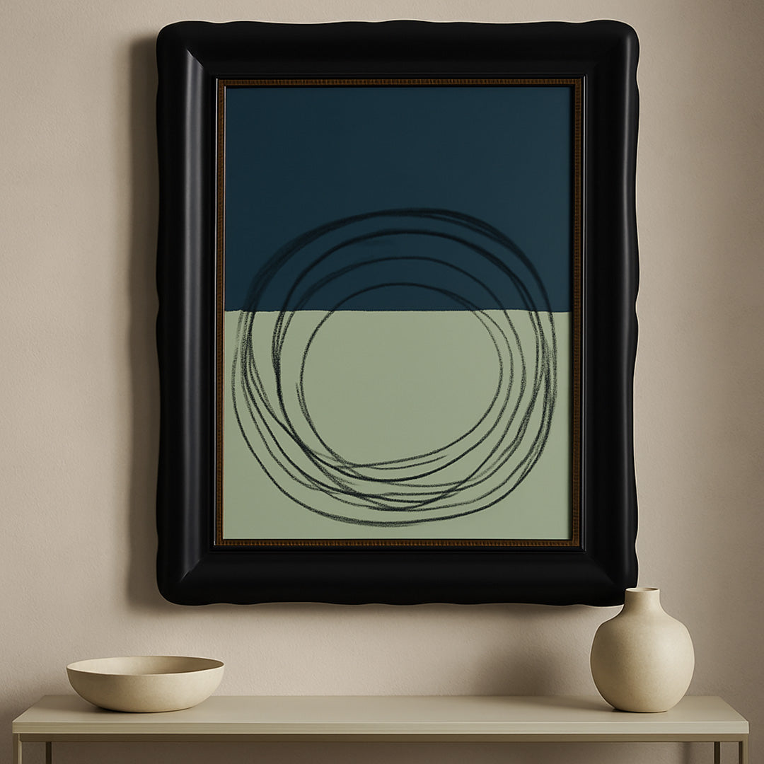Un’orbita scura attraversa il confine tra blu petrolio e salvia: un ritorno silenzioso, stabile e sospeso.