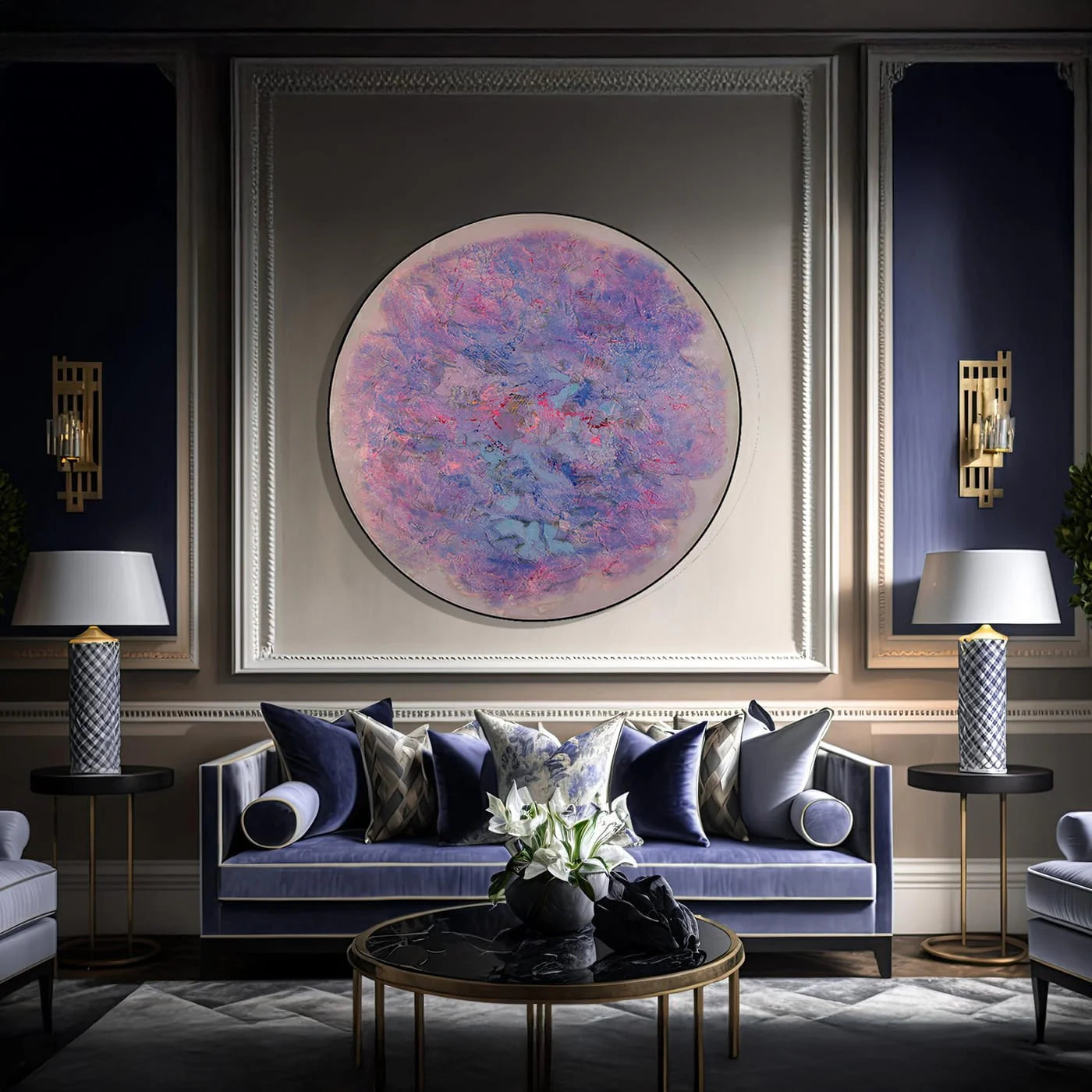 Un'opera d'arte che cattura la delicatezza e l'intimità delle tonalità viola, rosa e blu, evocando la tranquillità del crepuscolo o un mondo onirico. La forma circolare amplifica il senso di armonia, mentre le texture invitano l'osservatore a immergersi in una dimensione serena e introspettiva.