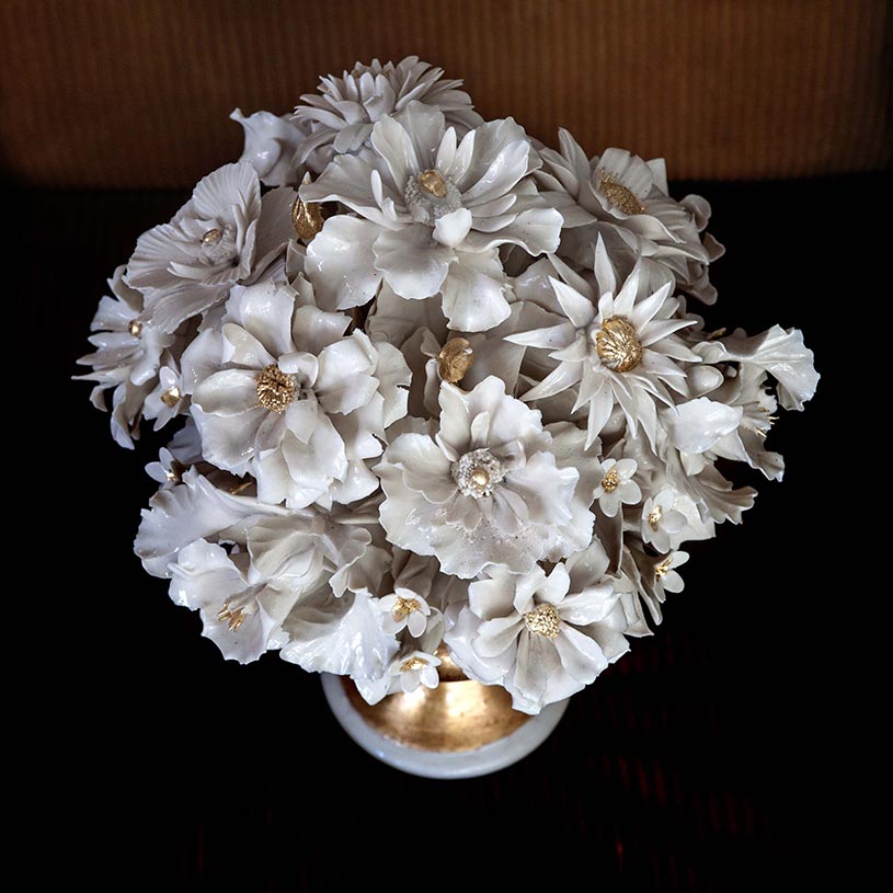 Works in biscuit or Capodimonte porcelain are made at the Caiafa Studio by Neapolitan ceramist masters which realize exclusive sculptures, art objects, lamp lights, frame decorations for Caiafa. Porcelain is a peculiar kind of ceramics that you can obtain at 1230 to 1300 centigrade heat. The artist draws the object he wants to realize. The sculptor makes a first rough shape on a gesso cast. Then it is modelled by chisel or hand to make the most accurate details. Then liquid porcelain is dried out. At this point it gets refined and imperfections or excess material are eliminated. For flowery compositions the artist shapes porcelain by hand. Furthermore, painted porcelains are made at 750 centigrade heat.