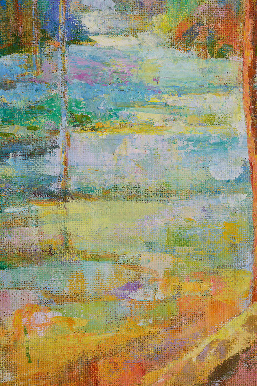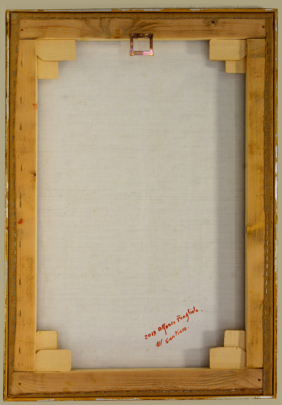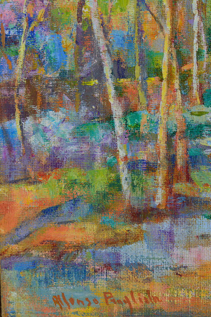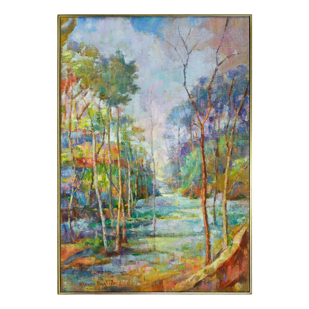 The artwork is set in a gilded wooden slat frame, subtly antiqued with silver leaf to enhance the painting’s delicate hues, bringing its overall dimensions to 83 × 58 cm. Al Sentiero is perfect for art collectors and nature enthusiasts who appreciate the fusion of classic landscape themes with modern and abstract techniques.