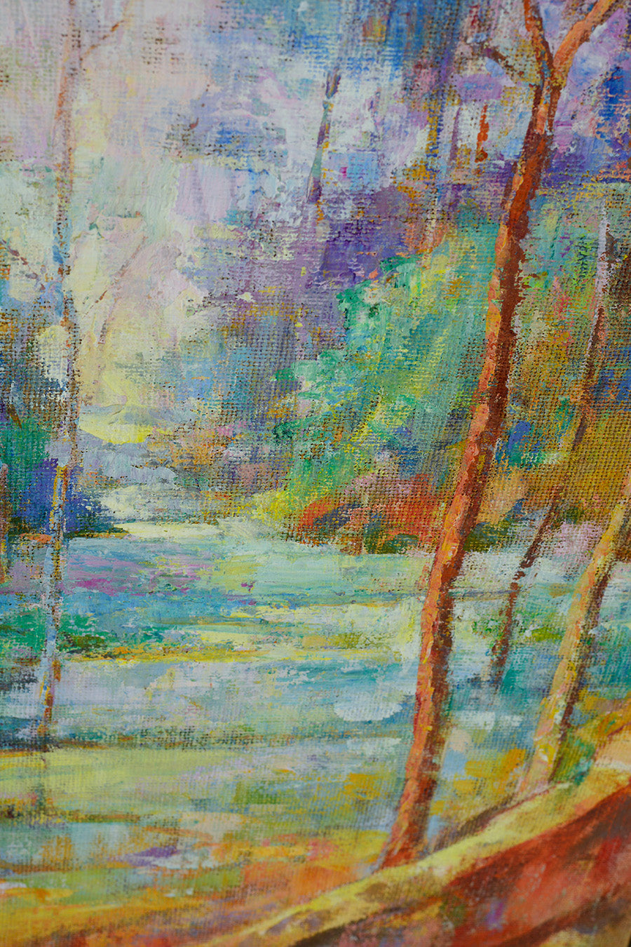Al Sentiero portrays a serene path winding through a sunlit forest, where light dances across the leaves and shimmers on the water, forming a soothing and evocative scene. Soft pastel tones and the intricate interplay of light and shadow invite the viewer to lose themselves in the quietude of this natural setting.