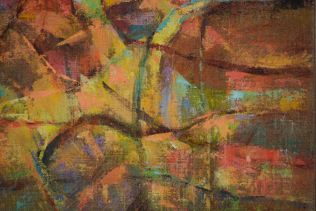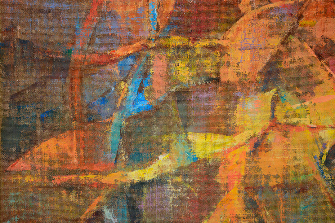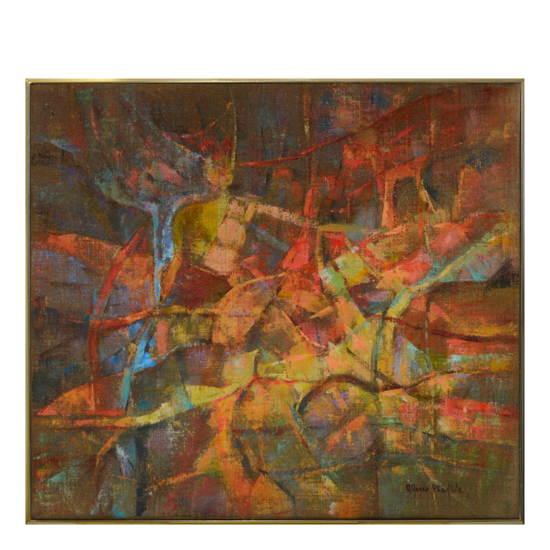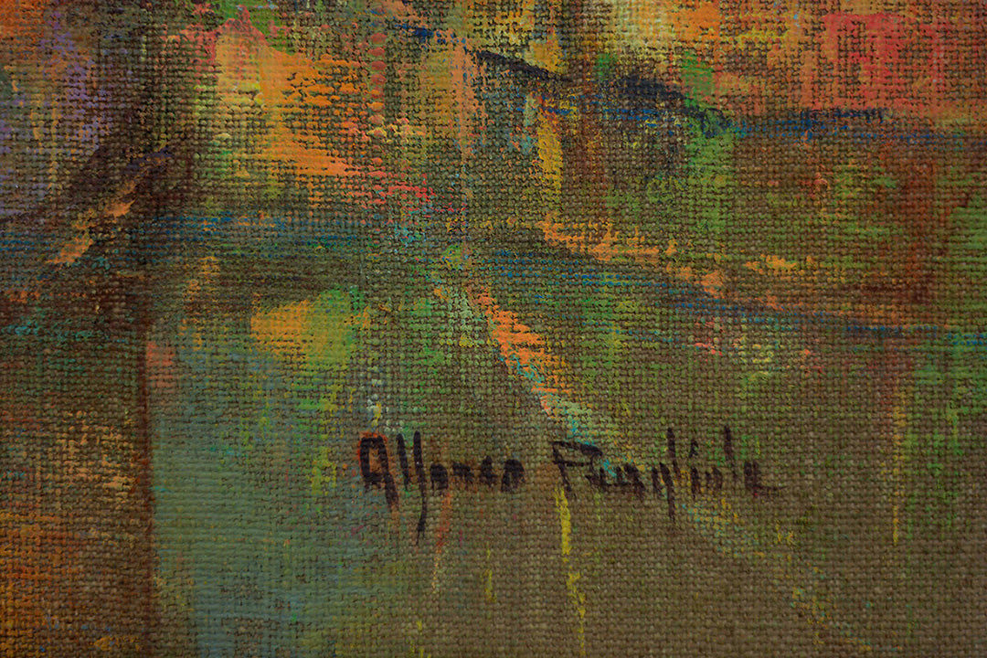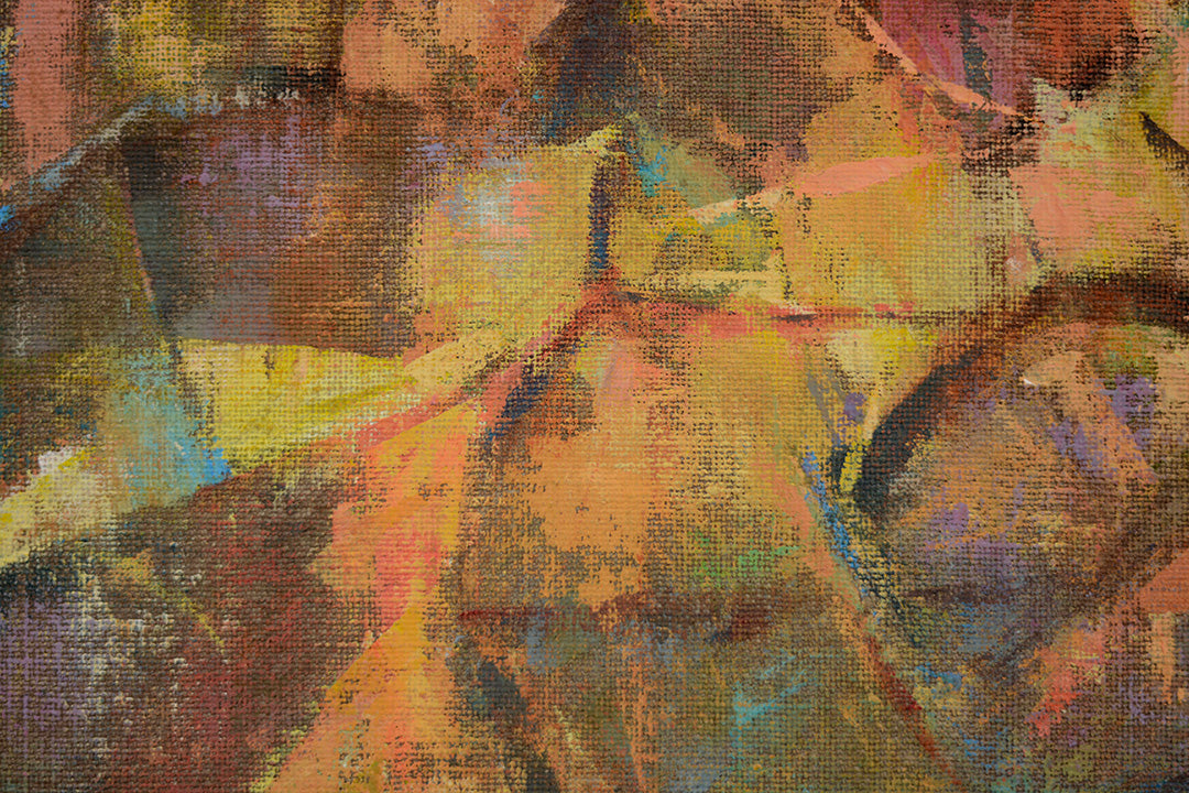 The painting is elegantly complemented by a slatted wooden frame, gilded with silver leaf and gently antiqued to provide a warm, rich tone that enhances the work’s overall sophistication. Please note that the dimensions provided refer to the framed artwork. The canvas itself measures 80 × 90 cm, giving it a substantial presence that will make a striking addition to any art collection.