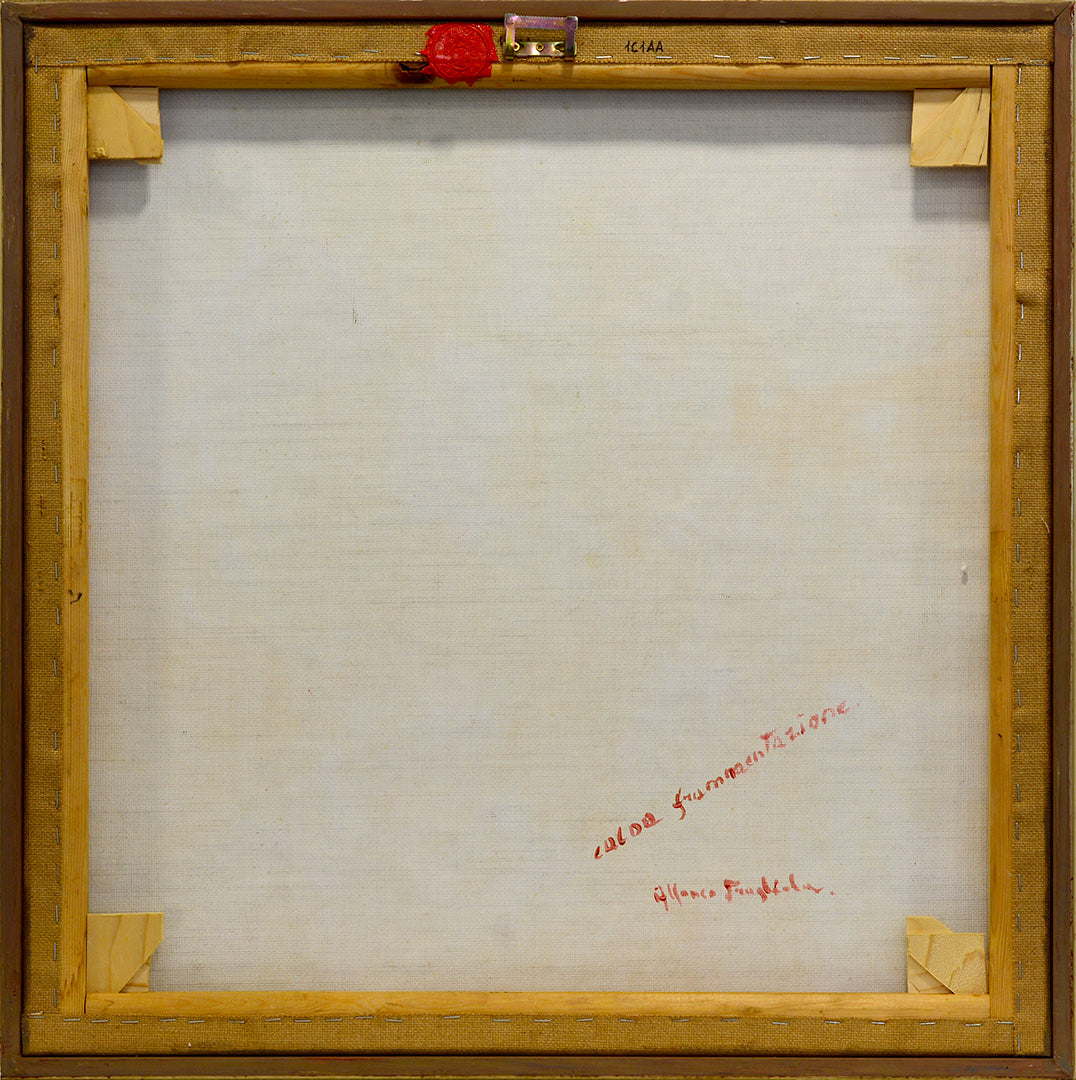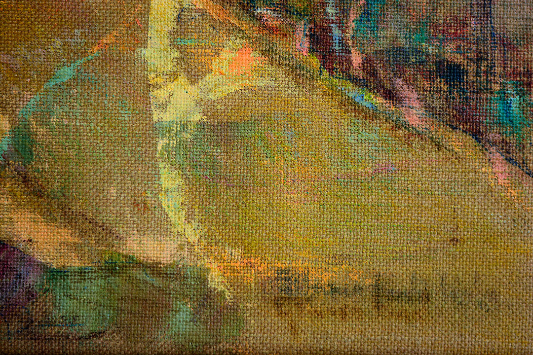 Pragliola’s Calda Frammentazione is a vibrant homage to classical art, revealing the artist’s personal emotions through a dynamic blend of mixed media techniques. Created on the reverse side of a coarse jute canvas, Pragliola employs oil paints, acrylics, and wax pastels to penetrate the fabric’s raw texture, giving the work a modern and distinctive character while honoring its classical subjects.