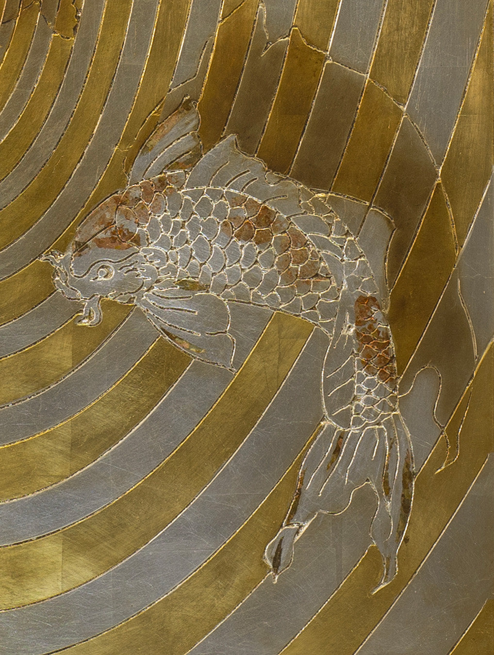 The medium of engraved wood, chalked, and gilded with gold and silver leaf was chosen to evoke a sense of timelessness and depth, enhancing the ethereal quality of the vortex. The subject matter of fish dancing within the vortex represents the harmony and interconnectedness of life. The style was selected to blend realism with elements of abstraction, inviting viewers to contemplate both the tangible and the intangible aspects of existence.
