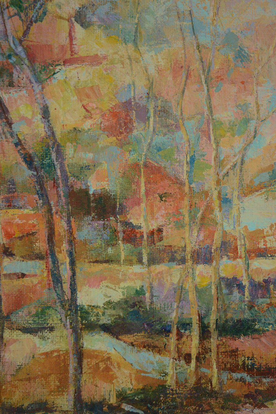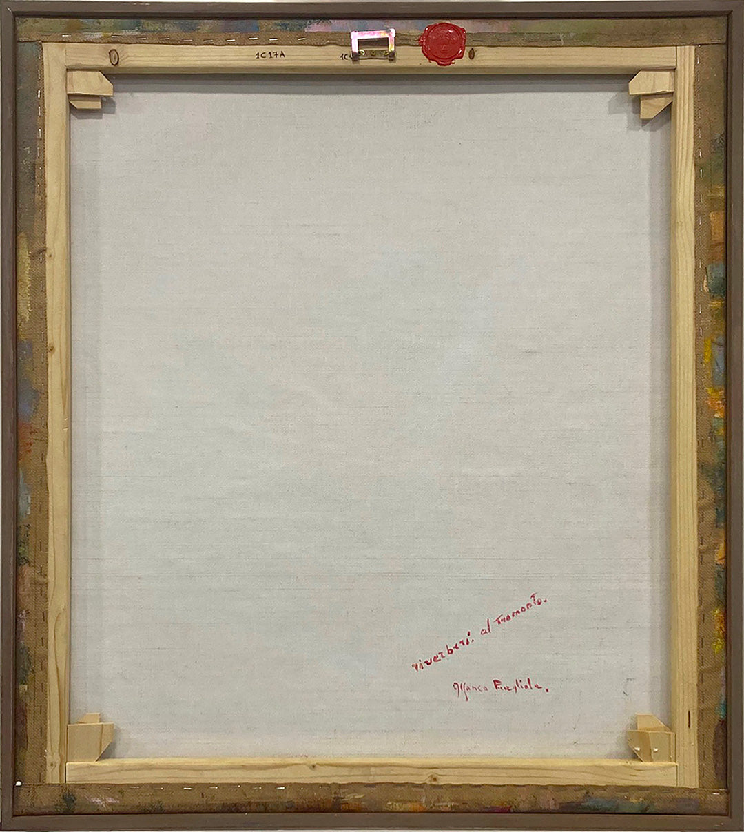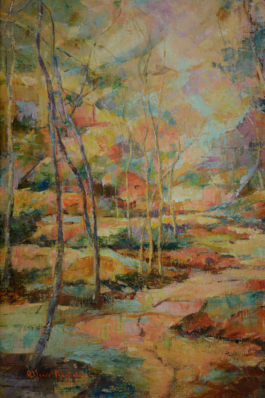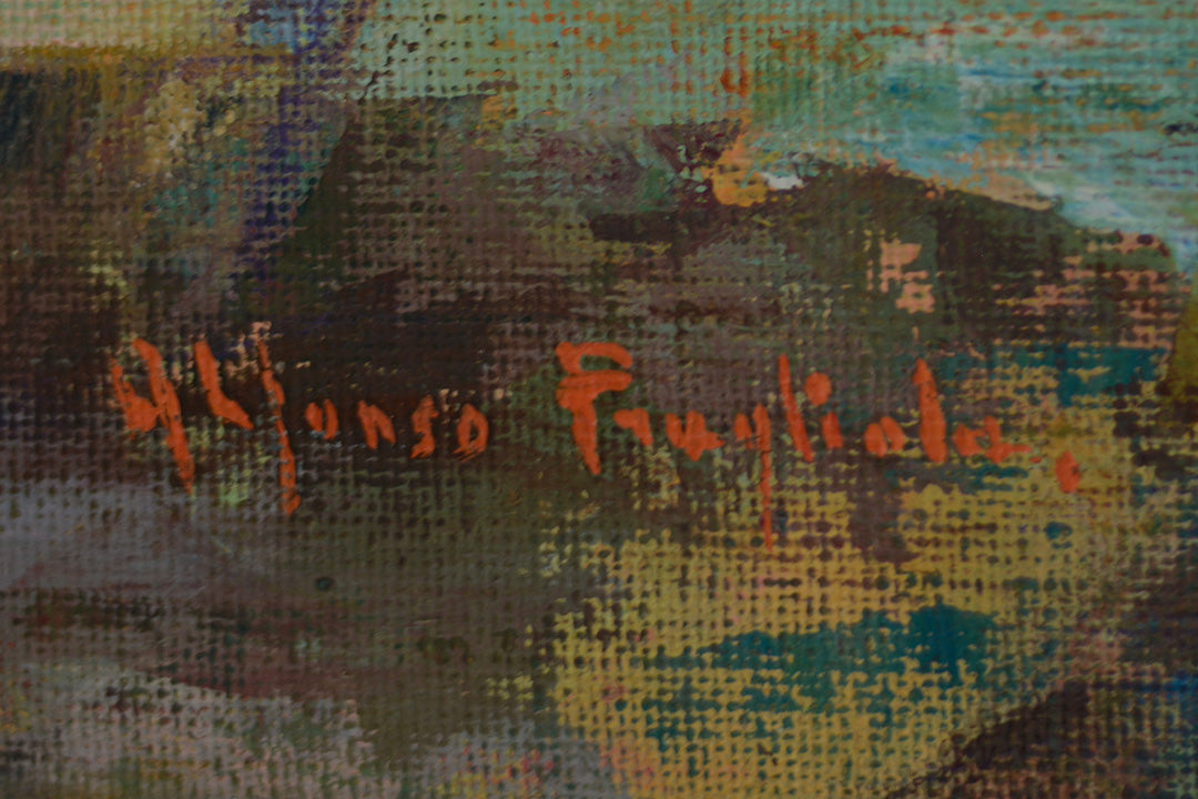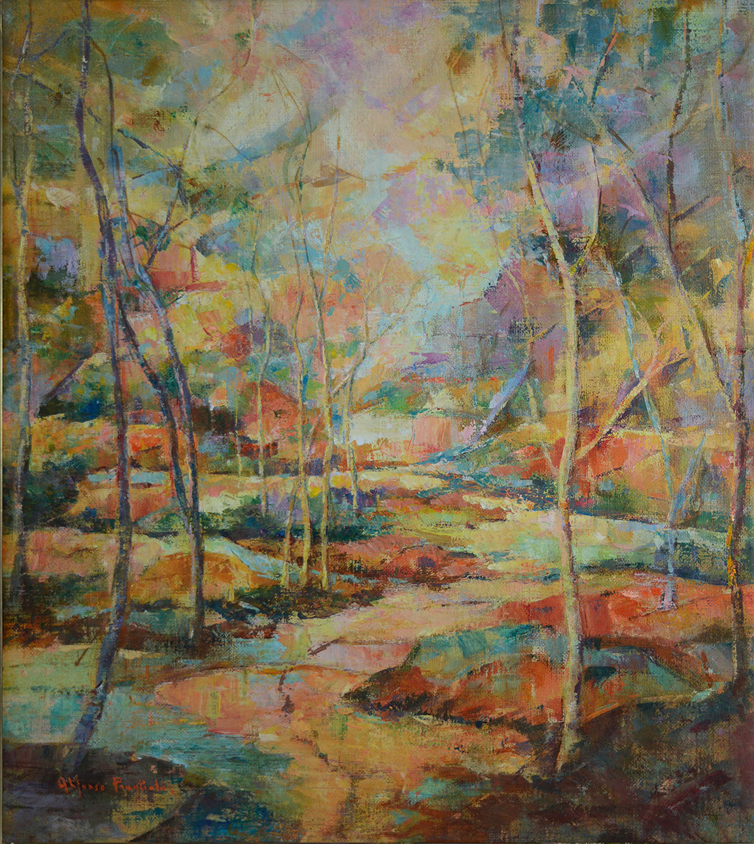 The painting is presented in a subtle gilded wooden frame, lightly antiqued to enhance the artwork’s warm tones. Riverberi al Tramonto is an ideal choice for collectors who appreciate the fusion of traditional landscape motifs with modern, abstract techniques.