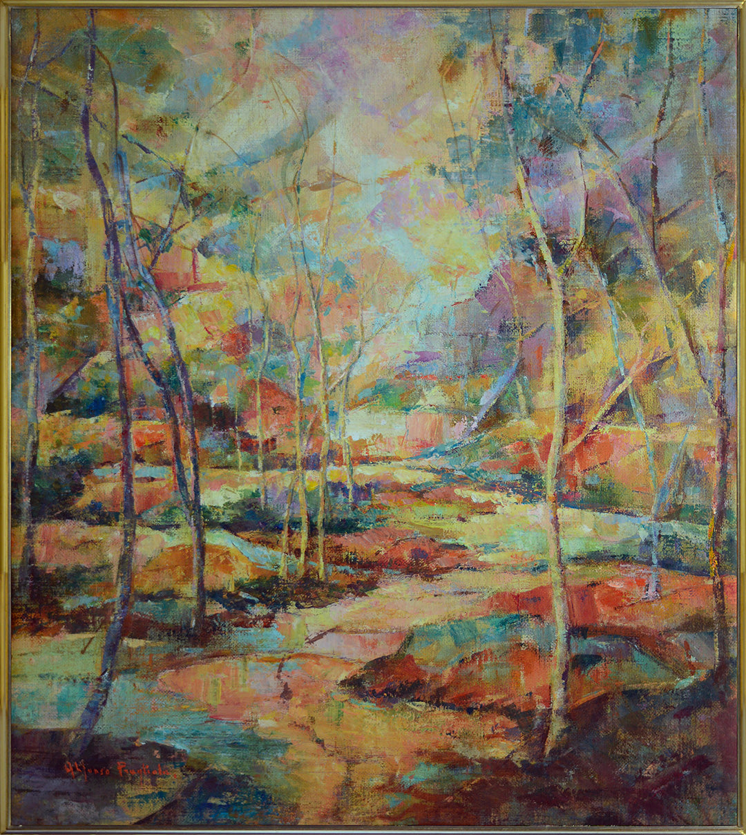 The artwork depicts a tranquil forest bathed in the golden light of the setting sun, where colors blend seamlessly to evoke a sense of peace and serenity. The interplay of light and shadow, paired with Pragliola’s masterful use of color, invites viewers to experience the calm and reflective atmosphere captured within the scene.