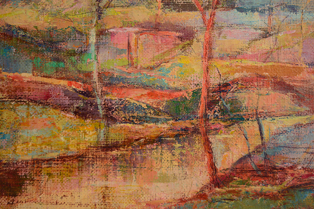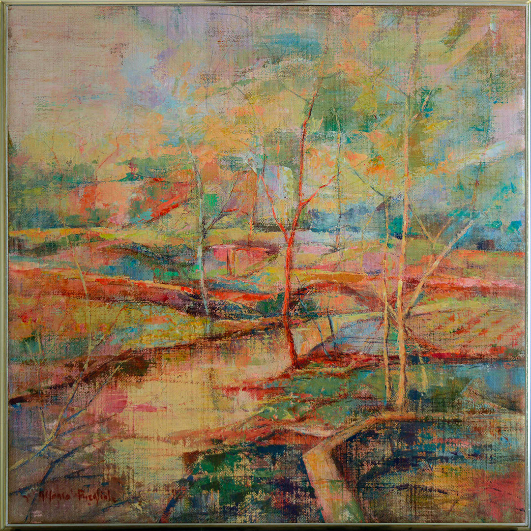 Abstract yet recognizable forms invite the viewer to explore the painting, making it an ideal piece for both art collectors and nature enthusiasts. The work is presented in a simple yet elegant silver-toned wooden frame, lightly patinated to add a subtle touch of refinement that complements the painting’s warm, vibrant palette. This piece is ready to bring its dynamic energy and rich colors into any space.