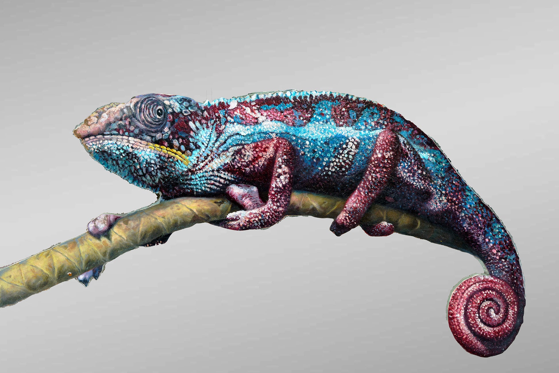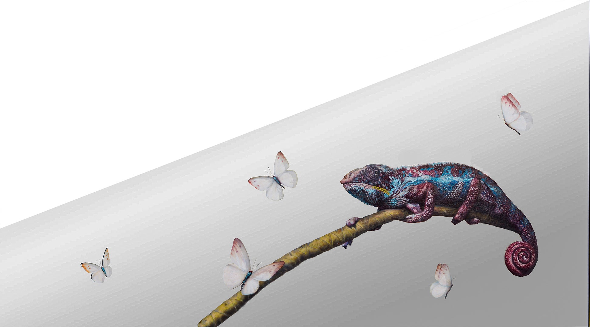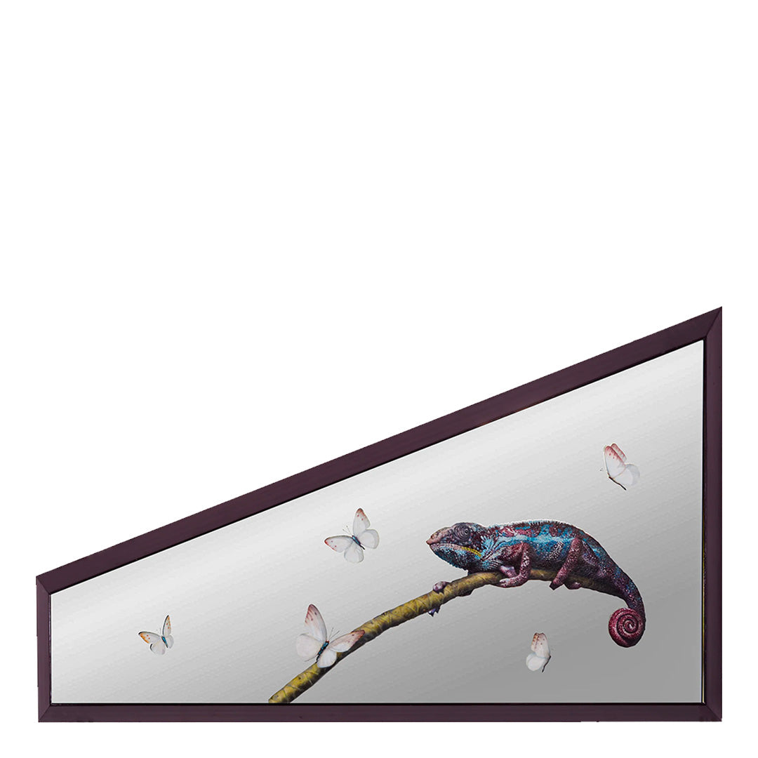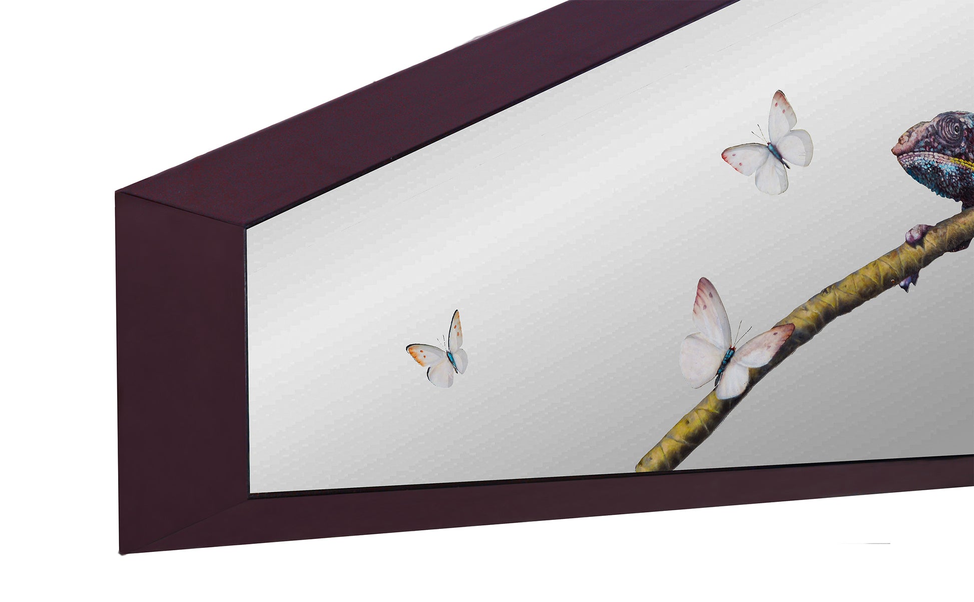 A chameleon carefully watches the light flight of the butterflies around it, in an atmosphere suspended between silence and movement. The mirror enhances the play of reflections, creating a dialogue between the viewer and the natural scene. The frame, in an elegant dark purple fading into gray, enriches the piece with refined subtlety, emphasizing the theme of transformation and adaptation. The composition evokes the delicacy of nature and the idea of constant metamorphosis, linking the artwork to a sense of grace and mystery.
